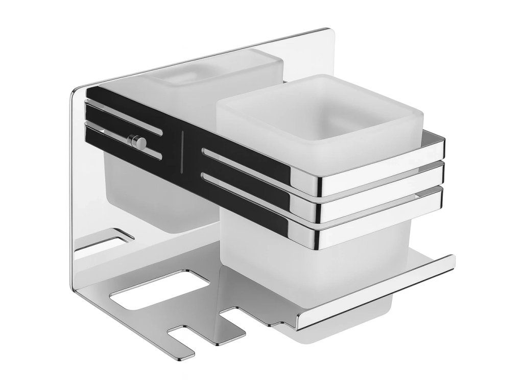 Samotný držák poskytuje ideální řešení pro hygienické zavěšení zubních kartáčků a vertikální postavení zubní pasty ve výřezech vedle sklenice.