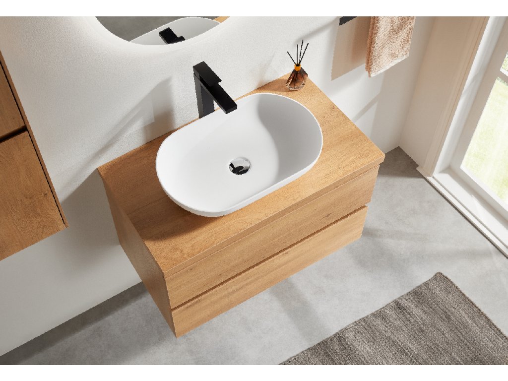 Koupelnové desky jsou vyrobeny z MDF lamina (středně hustá dřevovláknitá deska) s nalisovanou melaminovou fólií, která je odolná vůči vlhkosti, poškrábání, UV záření a běžným čisticím prostředkům. Povrch je hladký, tvrdý, homogenní a snadno se čistí. MDF desky se nekroutí jako masivní dřevo. Pokud dojde k mechanickému narušení laminace, samotné MDF jádro může navlhnout.