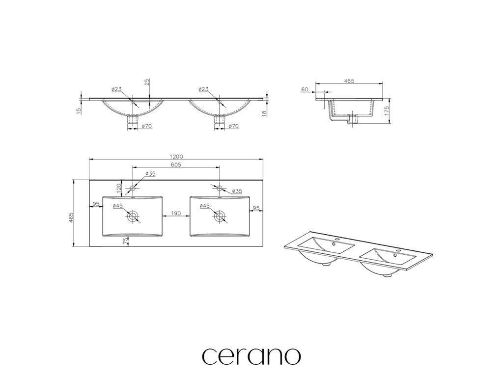 CERANO - Dvojumyvadlo keramické Todo - nábytkové - bílá lesklá - 120x46,5 cm
