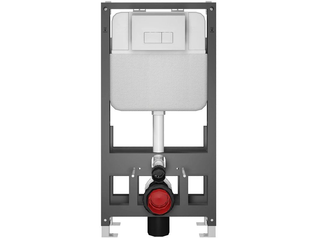 Tlačítko je umístěno v přední části rámu, což usnadňuje přístup a zajišťuje pohodlné ovládání splachování. Toto řešení je ideální pro koupelny, kde je preferováno jednoduché a snadno dostupné ovládání.