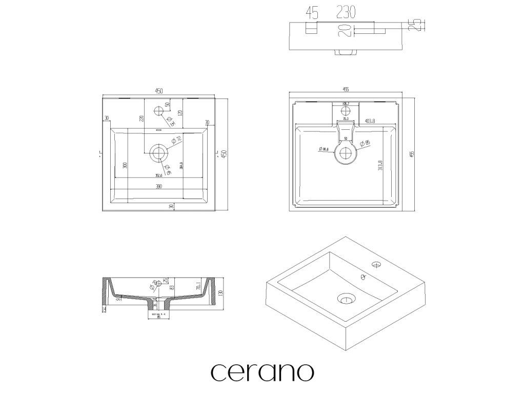 CERANO - Umyvadlo z litého mramoru Esme - s přepadem - bílá lesklá - 45x45 cm