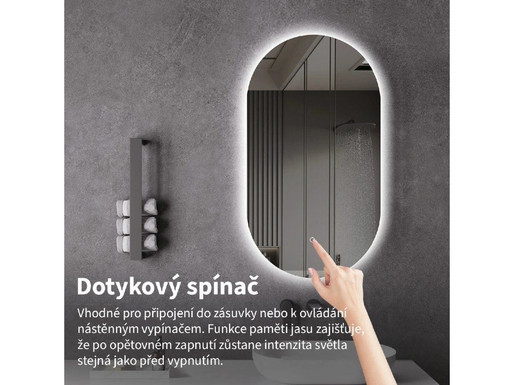 Osvětlení zrcadla lze snadno a pohodlně zapnout dotykem přepínače na panelu zrcadla. Umožňuje rychlé nastavení osvětlení bez nutnosti sahat po vzdálenějším tradičním vypínači.