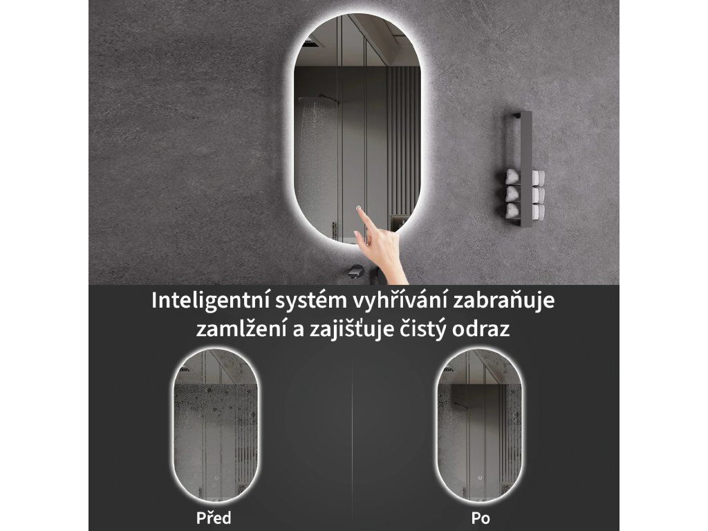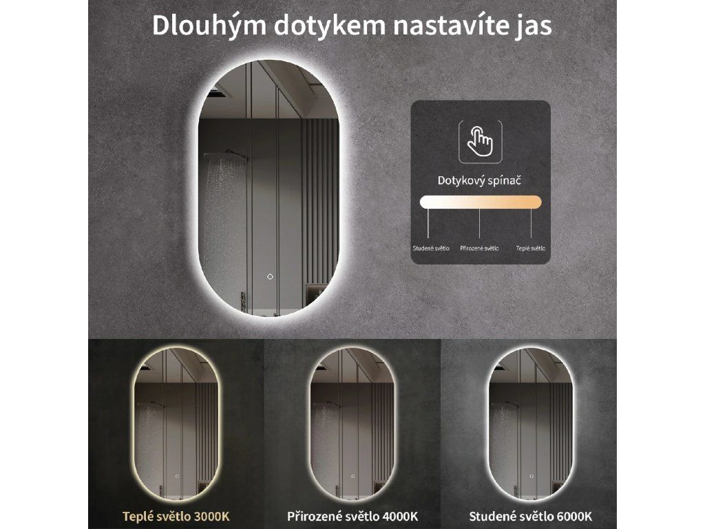 Zrcadlo je vybaveno LED osvětlením s nastavitelnou barvou světla – od 3000 K (teplá) do 6000 K (Neutrální). Přepínání barev jednoduše ovládáte dotykovým tlačítkem na ploše zrcadla. Poskytuje intenzivní a jasné světlo pro detailní péči i příjemné, jemné osvětlení pro relaxaci. Díky širokému rozsahu teploty barev tak snadno přizpůsobíte atmosféru aktuální potřebě.