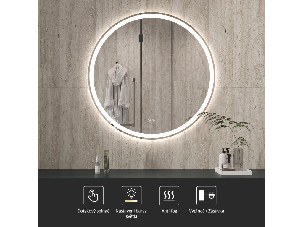 Zrcadlo je vybaveno LED osvětlením s nastavitelnou barvou světla – od 3000 K (teplá) do 6000 K (Neutrální). Přepínání barev jednoduše ovládáte dotykovým tlačítkem na ploše zrcadla. Poskytuje intenzivní a jasné světlo pro detailní péči i příjemné, jemné osvětlení pro relaxaci. Díky širokému rozsahu teploty barev tak snadno přizpůsobíte atmosféru aktuální potřebě.
