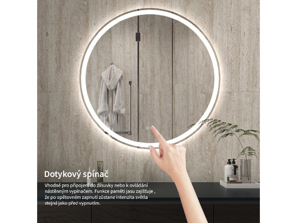 Osvětlení zrcadla lze snadno a pohodlně zapnout dotykem přepínače na panelu zrcadla. Umožňuje rychlé nastavení osvětlení bez nutnosti sahat po vzdálenějším tradičním vypínači.