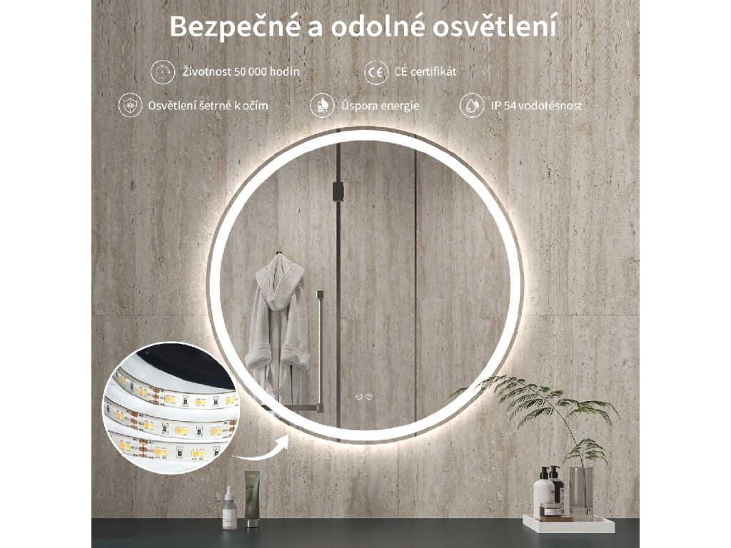 Zrcadlo je vybaveno LED osvětlením s nastavitelnou barvou světla – od 3000 K (teplá) do 6000 K (Neutrální). Přepínání barev jednoduše ovládáte dotykovým tlačítkem na ploše zrcadla. Poskytuje intenzivní a jasné světlo pro detailní péči i příjemné, jemné osvětlení pro relaxaci. Díky širokému rozsahu teploty barev tak snadno přizpůsobíte atmosféru aktuální potřebě.