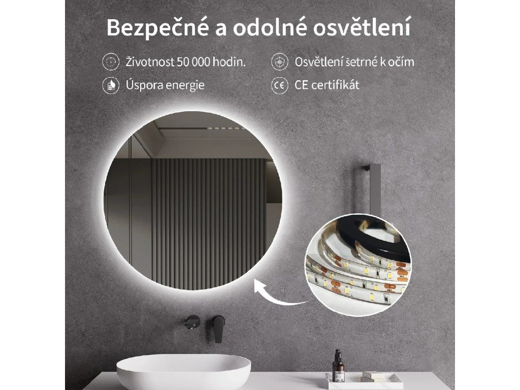 Zrcadlo je vybaveno zadním LED podsvícením, které svítí směrem ke stěně a vytváří jemný světelný efekt po celém obvodu. Rozptýlené světlo je vyzařováno z prostoru mezi rámem a zrcadlem, neoslňuje, zajišťuje rovnoměrné a příjemné nasvětlení prostoru koupelny.