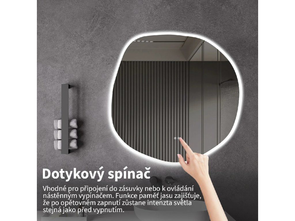 Osvětlení zrcadla lze snadno a pohodlně zapnout dotykem přepínače na panelu zrcadla. Umožňuje rychlé nastavení osvětlení bez nutnosti sahat po vzdálenějším tradičním vypínači.