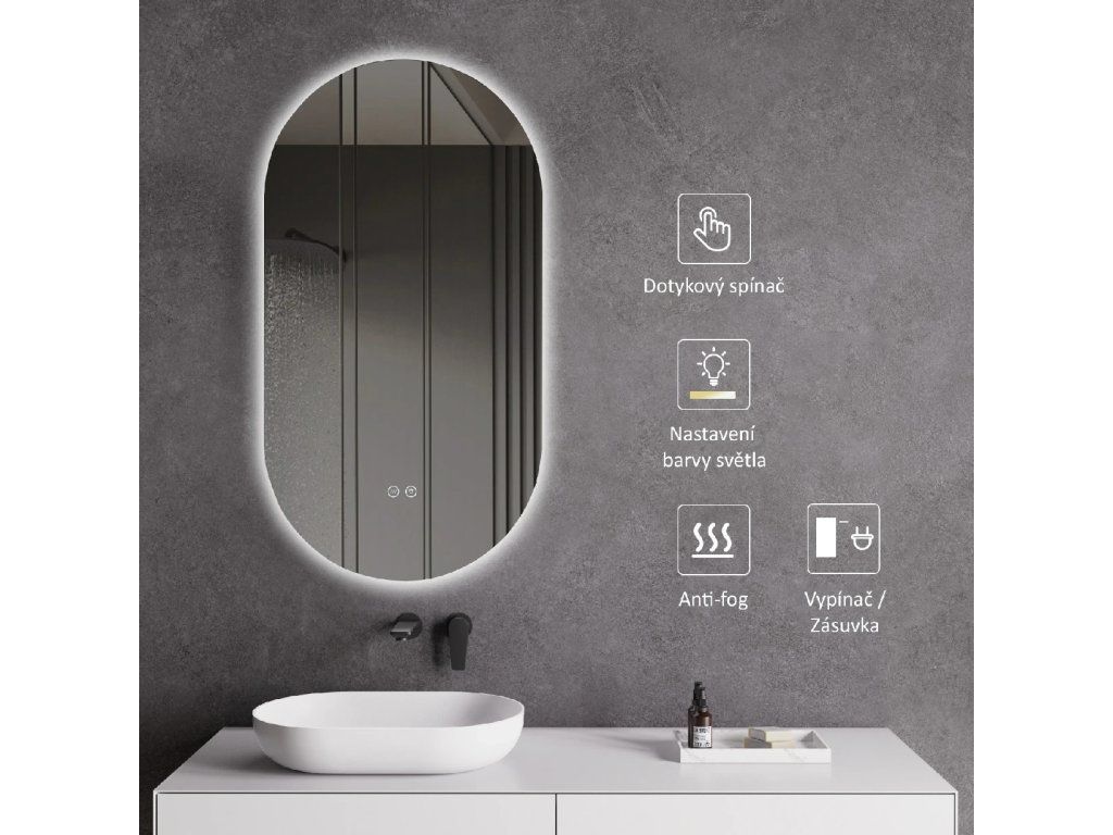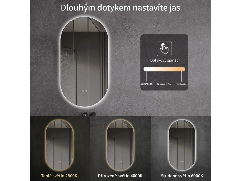 Zrcadlo je vybaveno LED osvětlením s nastavitelnou barvou světla – od 2800K (teplá) do 6000K (Neutrální). Poskytuje intenzivní a jasné osvětlení pro detailní péči i příjemné a jemné světlo pro relaxaci. Díky širokému rozsahu teploty barev lze přizpůsobit atmosféru dle potřeby.