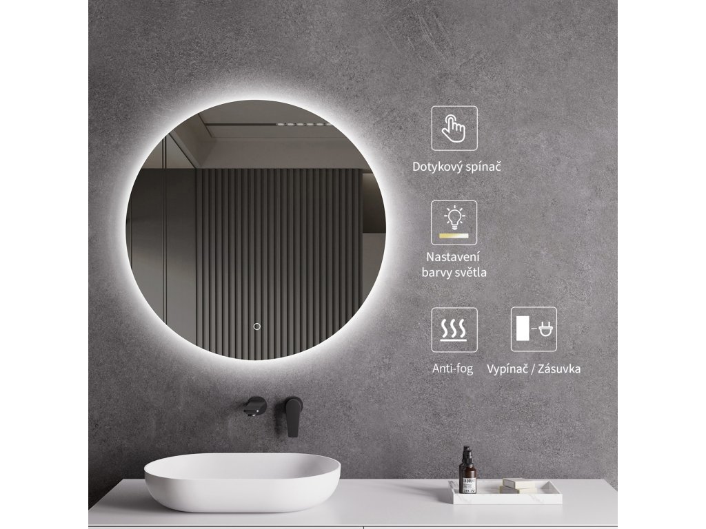 Zrcadlo je vybaveno LED osvětlením s nastavitelnou barvou světla – od 3000 K (teplá) do 6000 K (Neutrální). Přepínání barev jednoduše ovládáte dotykovým tlačítkem na ploše zrcadla. Poskytuje intenzivní a jasné světlo pro detailní péči i příjemné, jemné osvětlení pro relaxaci. Díky širokému rozsahu teploty barev tak snadno přizpůsobíte atmosféru aktuální potřebě.