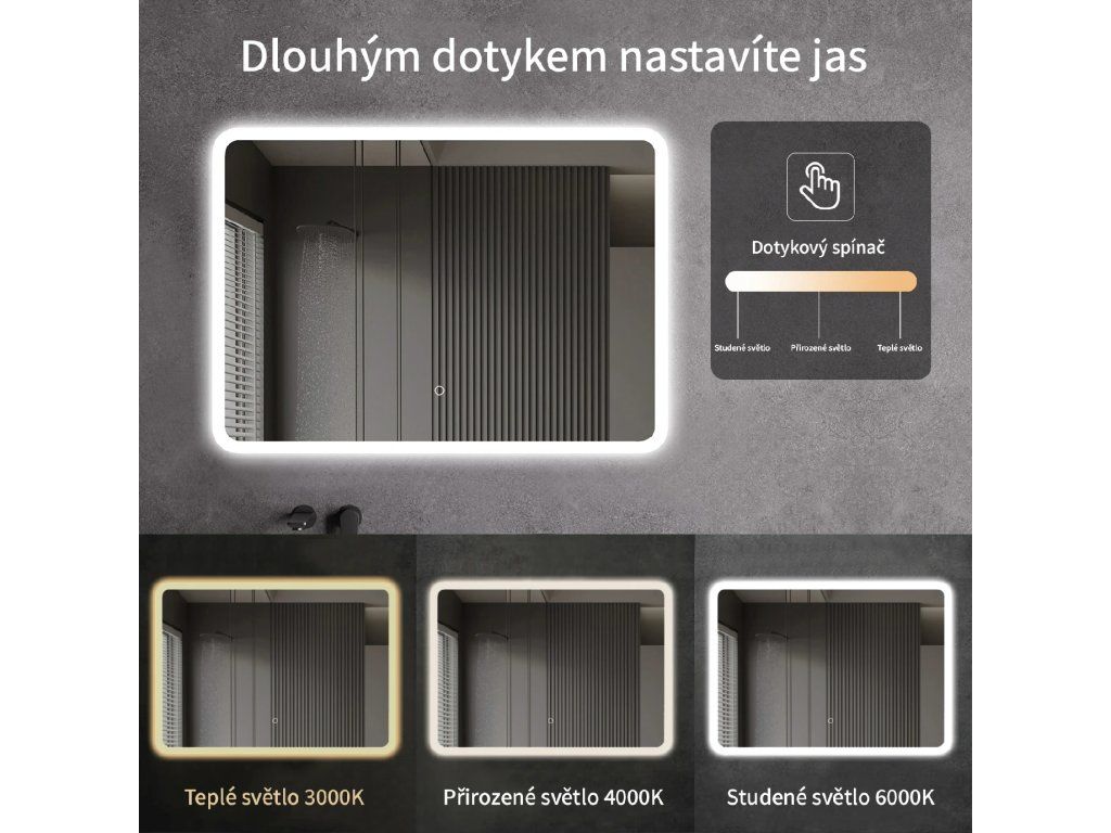 Zrcadlo je vybaveno LED osvětlením s nastavitelnou barvou světla – od 3000 K (teplá) do 6000 K (Neutrální). Přepínání barev jednoduše ovládáte dotykovým tlačítkem na ploše zrcadla. Poskytuje intenzivní a jasné světlo pro detailní péči i příjemné, jemné osvětlení pro relaxaci. Díky širokému rozsahu teploty barev tak snadno přizpůsobíte atmosféru aktuální potřebě.