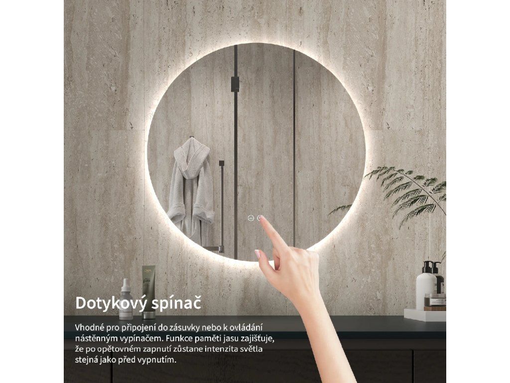 Osvětlení zrcadla lze snadno a pohodlně zapnout dotykem přepínače na panelu zrcadla. Umožňuje rychlé nastavení osvětlení bez nutnosti sahat po vzdálenějším tradičním vypínači.
