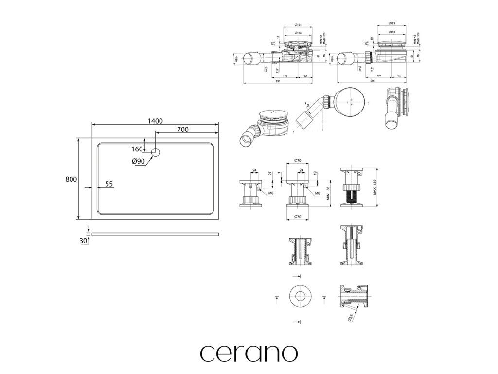 CERANO - Sprchový vaničkový set Piato - litý mramor - bílá lesklá - 140x80 cm + nožičky + sifon sprch.vaničky