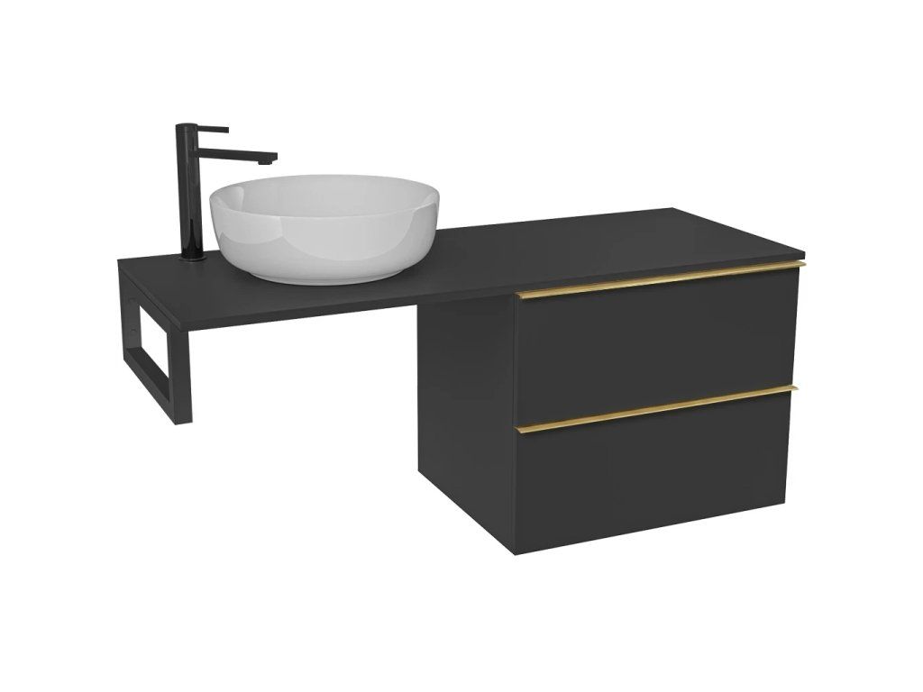 CERANO - Deska pod umyvadlo Navira Slim - 141x46,5x1,8 cm - skříňka Velora 69 cm - černá matná, zlatá úchytka - konzole černá