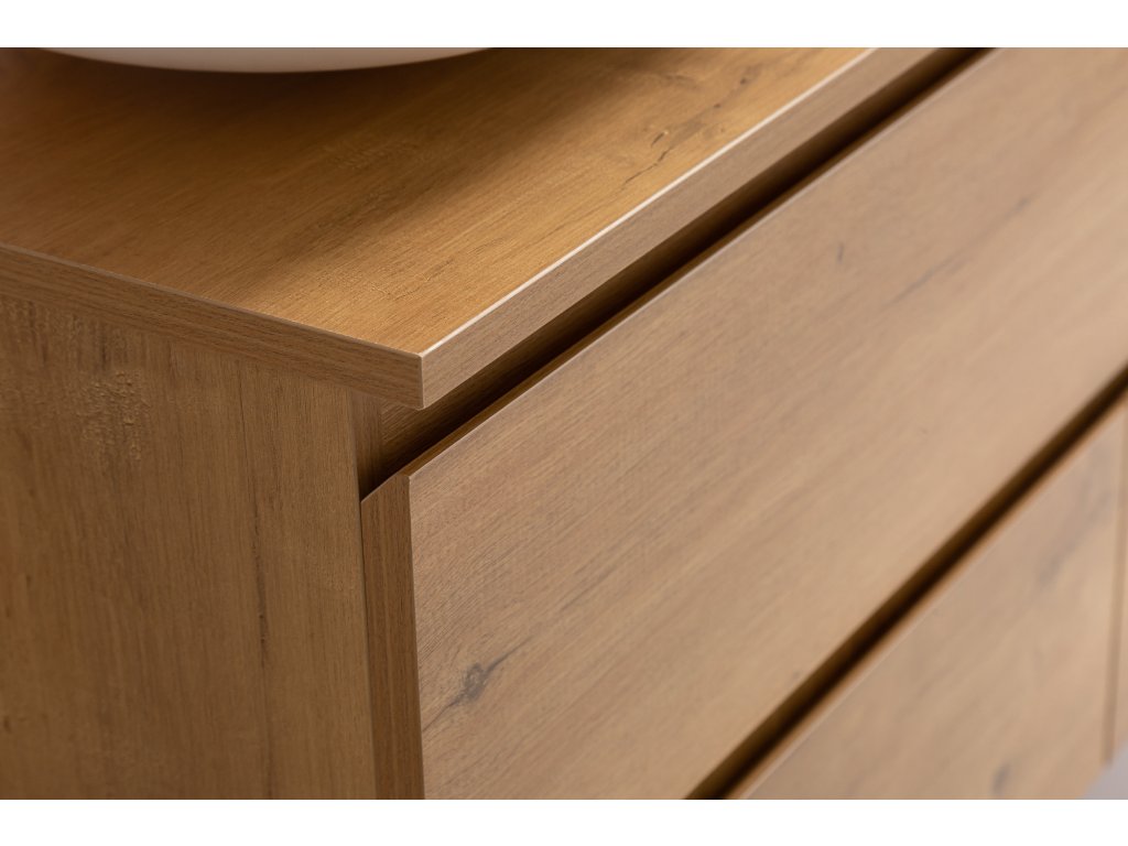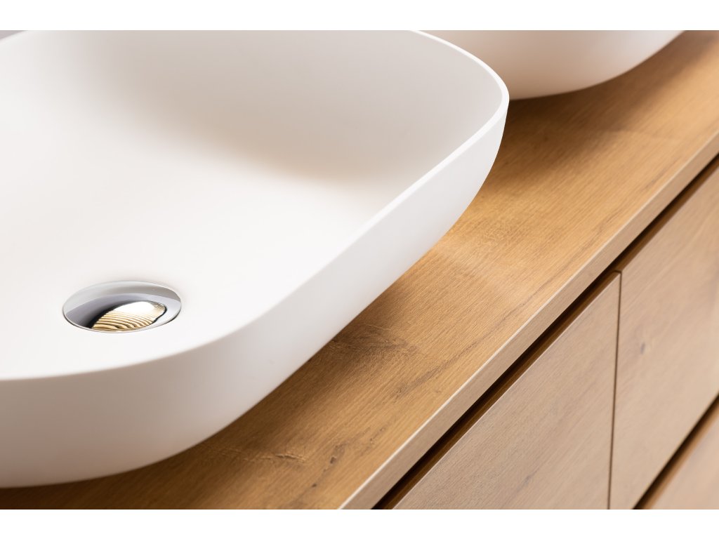 Koupelnové skříňky jsou vyrobeny z MDF lamina (středně hustá dřevovláknitá deska) s nalisovanou melaminovou fólií, která je odolná vůči vlhkosti, poškrábání, UV záření a běžným čisticím prostředkům. Povrch je hladký, tvrdý, homogenní a snadno se čistí. MDF desky se nekroutí jako masivní dřevo. Pokud dojde k mechanickému narušení laminace, samotné MDF jádro může navlhnout.