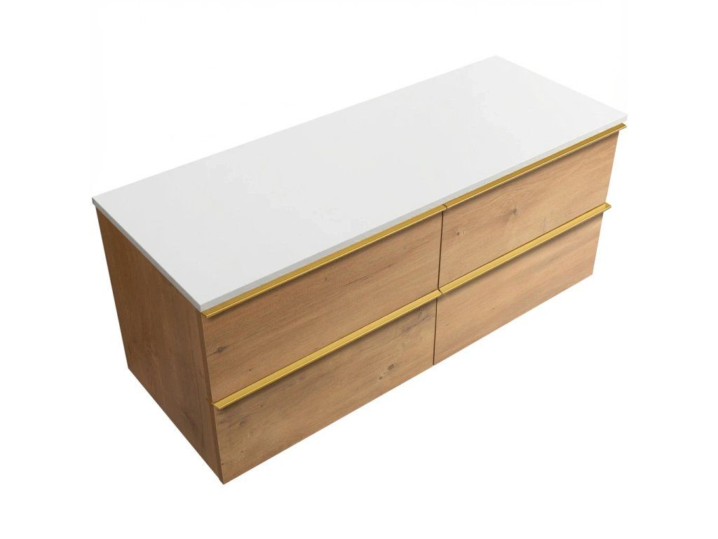 CERANO - Koupelnová skříňka pod umyvadlo Velora s úchytkou/deskou z litého mramoru Elanys - 12 mm - dub medový, zlatá úchytka - 158x53x45,2 cm