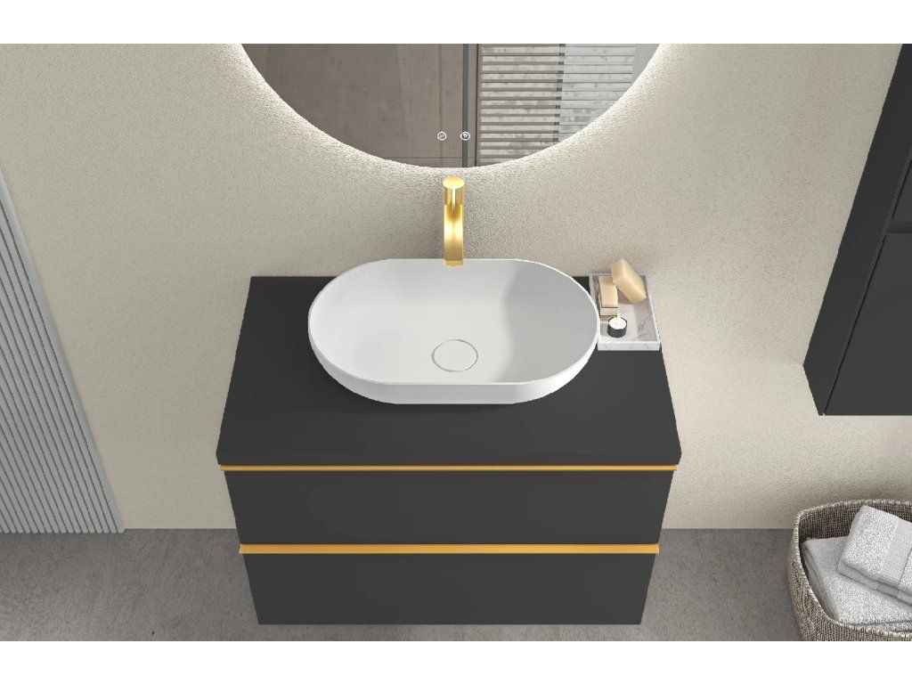 CERANO - Koupelnová skříňka Velora - černá matná, úchytka zlatá + deska pod umyvadlo Navira Pro - 36 mm - 80x56,6x46,5 cm