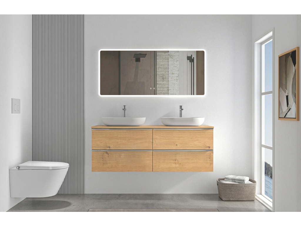 CERANO - Koupelnová skříňka Velora - dub medový, úchytka chromová + deska pod umyvadlo Navira Slim - 18 mm - 140x54,8x46,5 cm