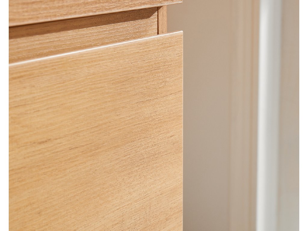 Koupelnové skříňky jsou vyrobeny z MDF lamina (středně hustá dřevovláknitá deska) s nalisovanou melaminovou fólií, která je odolná vůči vlhkosti, poškrábání, UV záření a běžným čisticím prostředkům. Povrch je hladký, tvrdý, homogenní a snadno se čistí. MDF desky se nekroutí jako masivní dřevo. Pokud dojde k mechanickému narušení laminace, samotné MDF jádro může navlhnout.