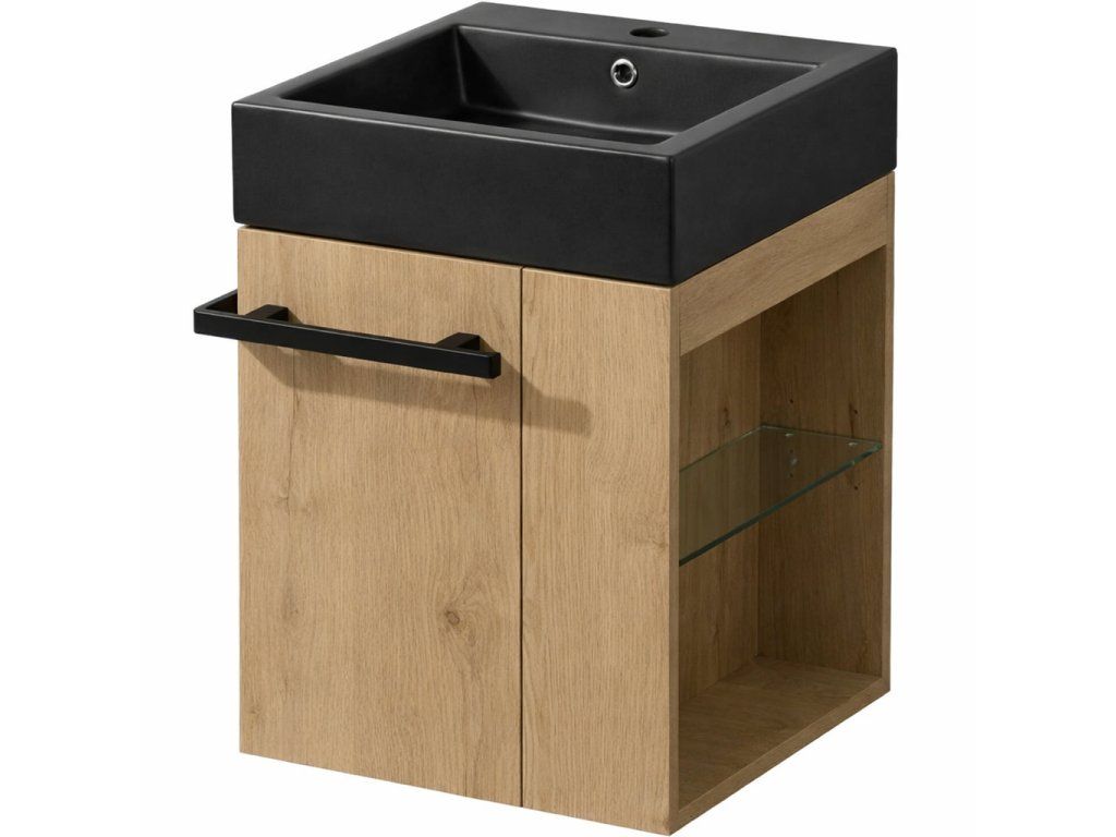 CERANO - Koupelnová skříňka Esme - dub medový + umyvadlo z lit. mramoru - černá matná - 45x45x62,5 cm