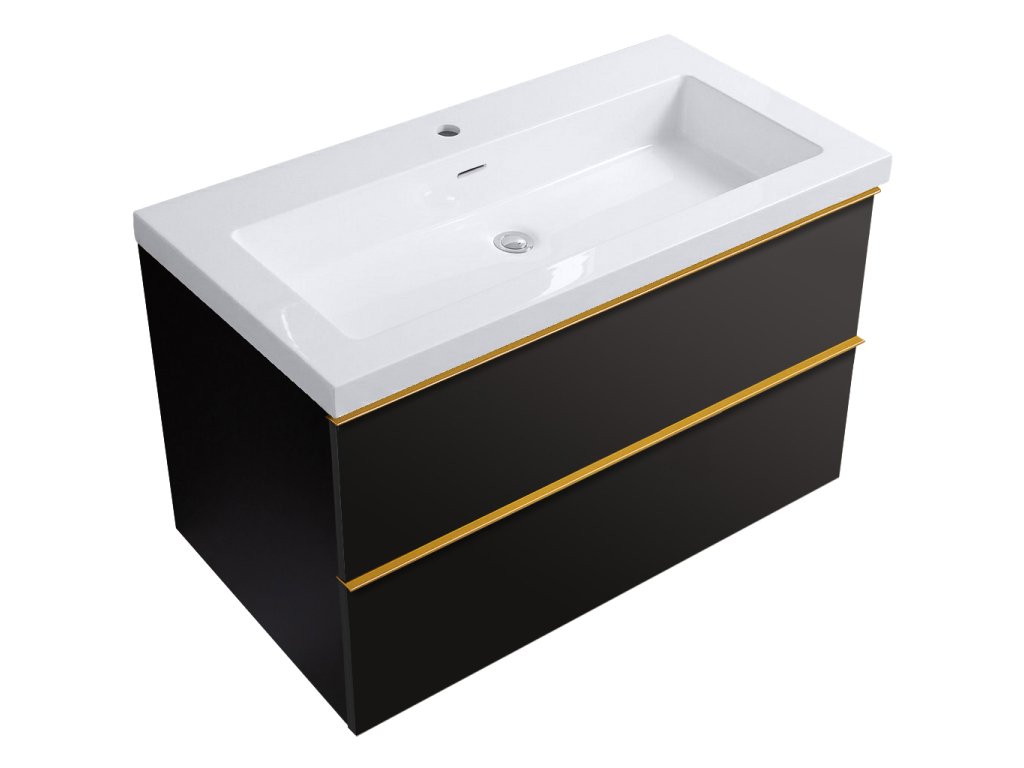 CERANO - Koupelnová skříňka Velora - bílá lesklá - úchytka zlatá + keramické umyvadlo Ovo - černá matná - 99x53x46 cm