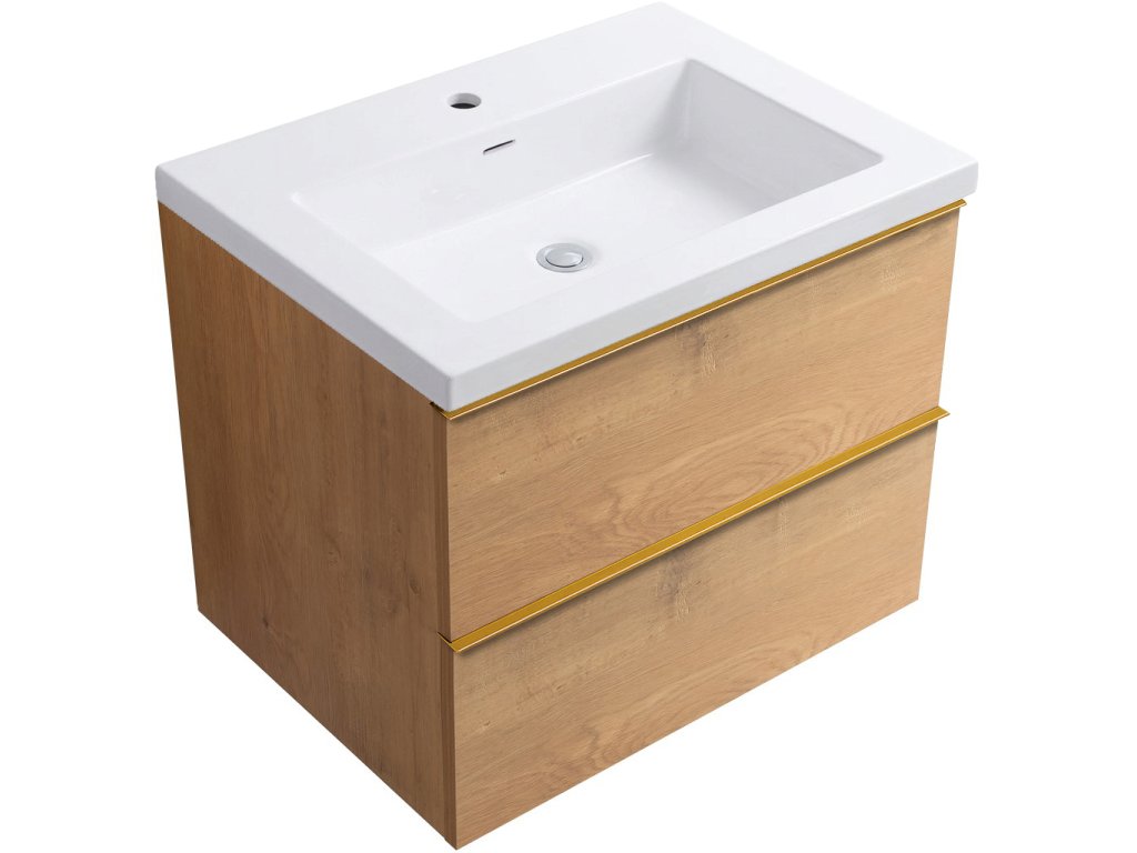 CERANO - Koupelnová skříňka Velora - bílá lesklá - úchytka zlatá + keramické umyvadlo Ovo - dub medový - 69x53x46 cm