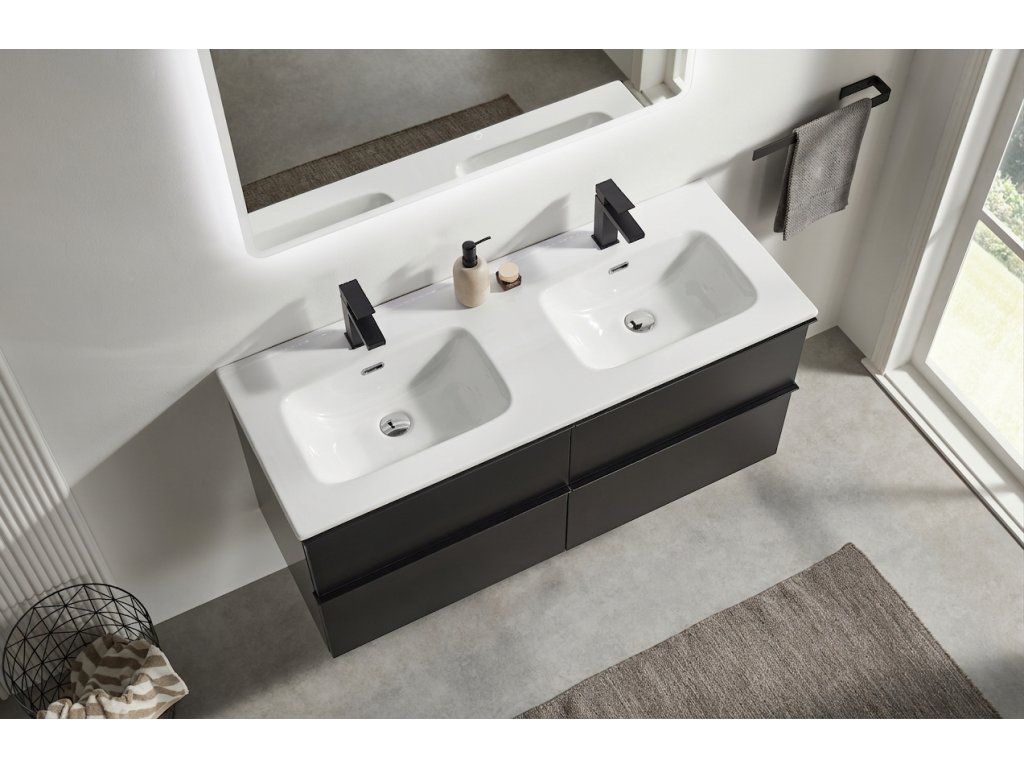 CERANO - Koupelnová skříňka Velora - černá matná, úchytka černá + keramické umyvadlo Novo - bílá lesklá - 121x54,5x46,5 cm