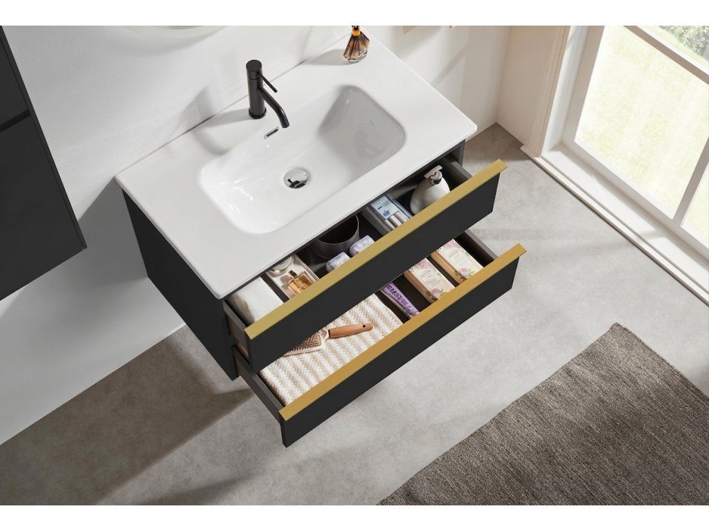 CERANO - Koupelnová skříňka Velora - černá matná, úchytka zlatá + keramické umyvadlo Novo - bílá lesklá - 81x54,5x46,5 cm
