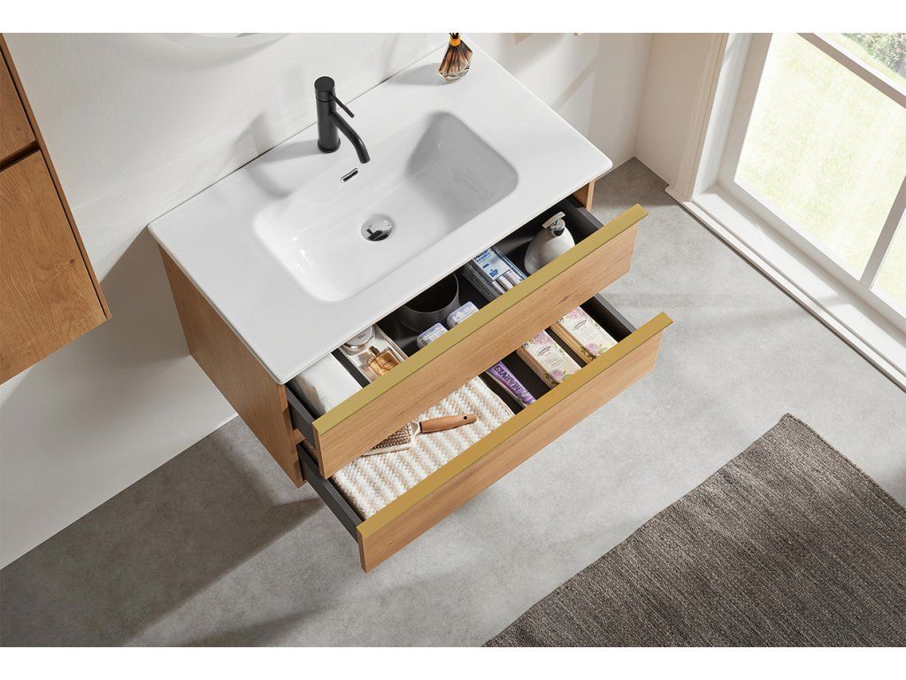 CERANO - Koupelnová skříňka Velora - dub medový, úchytka zlatá + keramické umyvadlo Novo - bílá lesklá - 101x54,5x46,5 cm