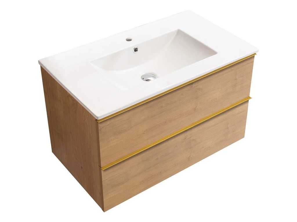 CERANO - Koupelnová skříňka Velora - dub medový, úchytka zlatá + keramické umyvadlo Todo - 101x55x46,5 cm