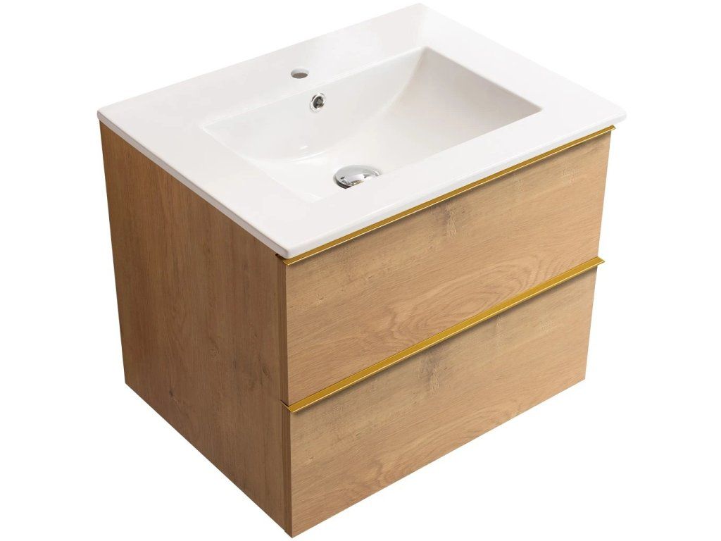 CERANO - Koupelnová skříňka Velora - dub medový, úchytka zlatá + keramické umyvadlo Todo - 61x55x46,5 cm
