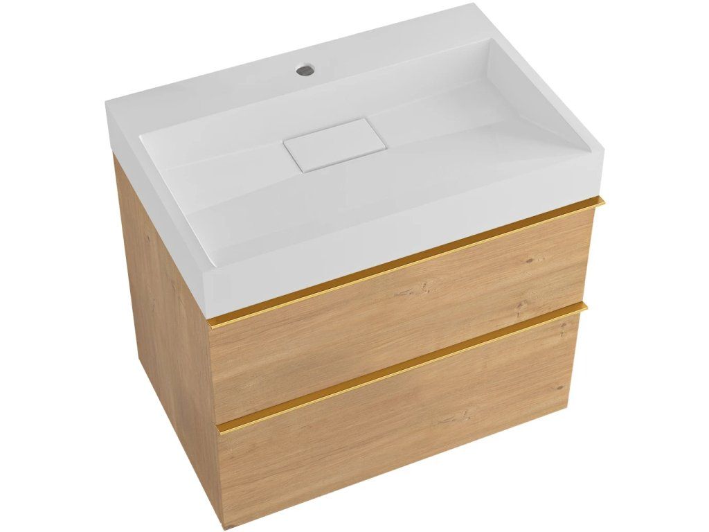 CERANO - Koupelnová skříňka Velora - dub medový, úchytka zlatá + umyvadlo z lit. mramoru s otvorem Vita - bílá matná - 70x63x46,5 cm