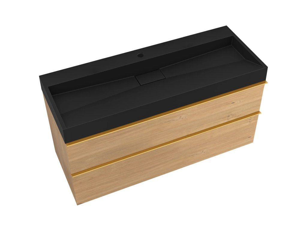 CERANO - Koupelnová skříňka Velora - dub medový, úchytka zlatá + umyvadlo z lit. mramoru s otvorem Vita - černá matná - 100x63x46,5 cm