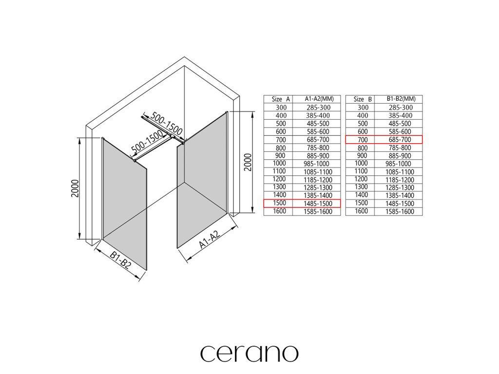 V rámci této série nabízíme širokou škálu rozměrů, abychom uspokojili různé potřeby našich zákazníků. Všechny sprchové kouty, dveře a zástěny značky Cerano jsou plně kompatibilní se sprchovými vaničkami Cerano ve stejných rozměrech, což zajišťuje bezproblémovou instalaci a dokonalé sladění. Sprchový kout lze navíc instalovat flexibilně – buď na odpovídající sprchovou vaničku, nebo přímo na podlahu podle vašich preferencí a možností koupelny.