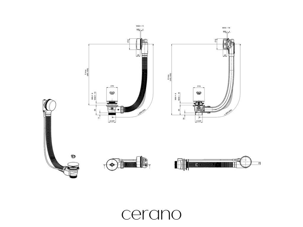 CERANO - Vanová souprava ovládací bovdenem 6/4“ - zátka 72mm - černá matná - 60 cm