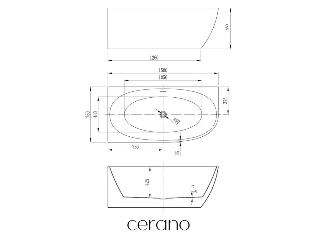 CERANO - Volně stojící akrylátová vana Livia, levá - bílá lesklá - 150x75 cm