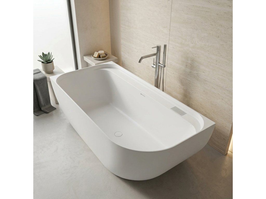 Přepad je pevnou součástí vany z litého mramoru a je vytvořen přímo jako součást odlitku ve formě, proto není nutné instalovat celý vanový komplet, ale pouze vanovou výpusť. Díky slim provedení působí úzký přepadový otvor nenápadně a nenarušuje čisté linie vany.
