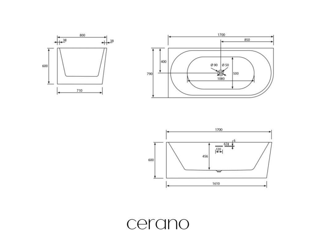 CERANO - Volně stojící akrylátová vana Bianco, levá - černá matná/bílá lesklá - 170x79 cm