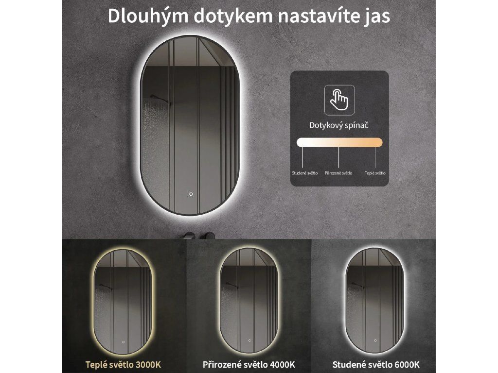 Zrcadlo je vybaveno LED osvětlením s nastavitelnou barvou světla – od 3000 K (teplá) do 6000 K (Neutrální). Přepínání barev jednoduše ovládáte dotykovým tlačítkem na ploše zrcadla. Poskytuje intenzivní a jasné světlo pro detailní péči i příjemné, jemné osvětlení pro relaxaci. Díky širokému rozsahu teploty barev tak snadno přizpůsobíte atmosféru aktuální potřebě.