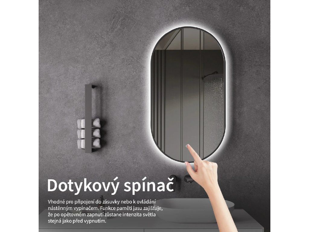 Osvětlení zrcadla lze snadno a pohodlně zapnout dotykem přepínače na panelu zrcadla. Umožňuje rychlé nastavení osvětlení bez nutnosti sahat po vzdálenějším tradičním vypínači.