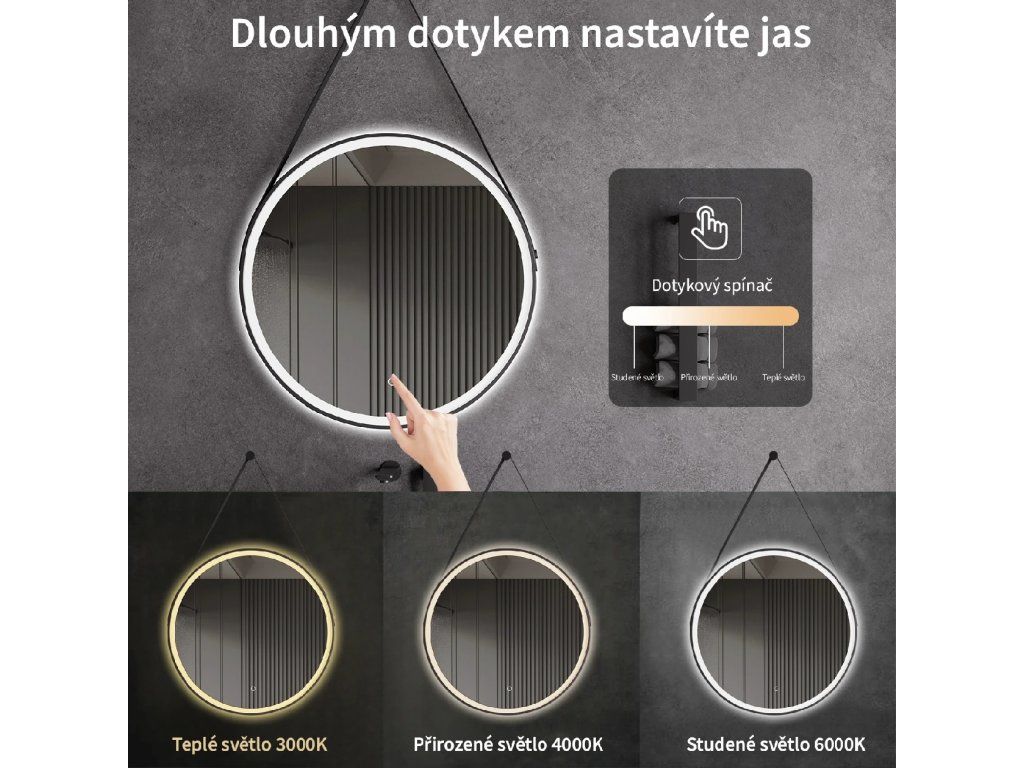 Zrcadlo je vybaveno LED osvětlením s nastavitelnou barvou světla – od 3000 K (teplá) do 6000 K (Neutrální). Přepínání barev jednoduše ovládáte dotykovým tlačítkem na ploše zrcadla. Poskytuje intenzivní a jasné světlo pro detailní péči i příjemné, jemné osvětlení pro relaxaci. Díky širokému rozsahu teploty barev tak snadno přizpůsobíte atmosféru aktuální potřebě.